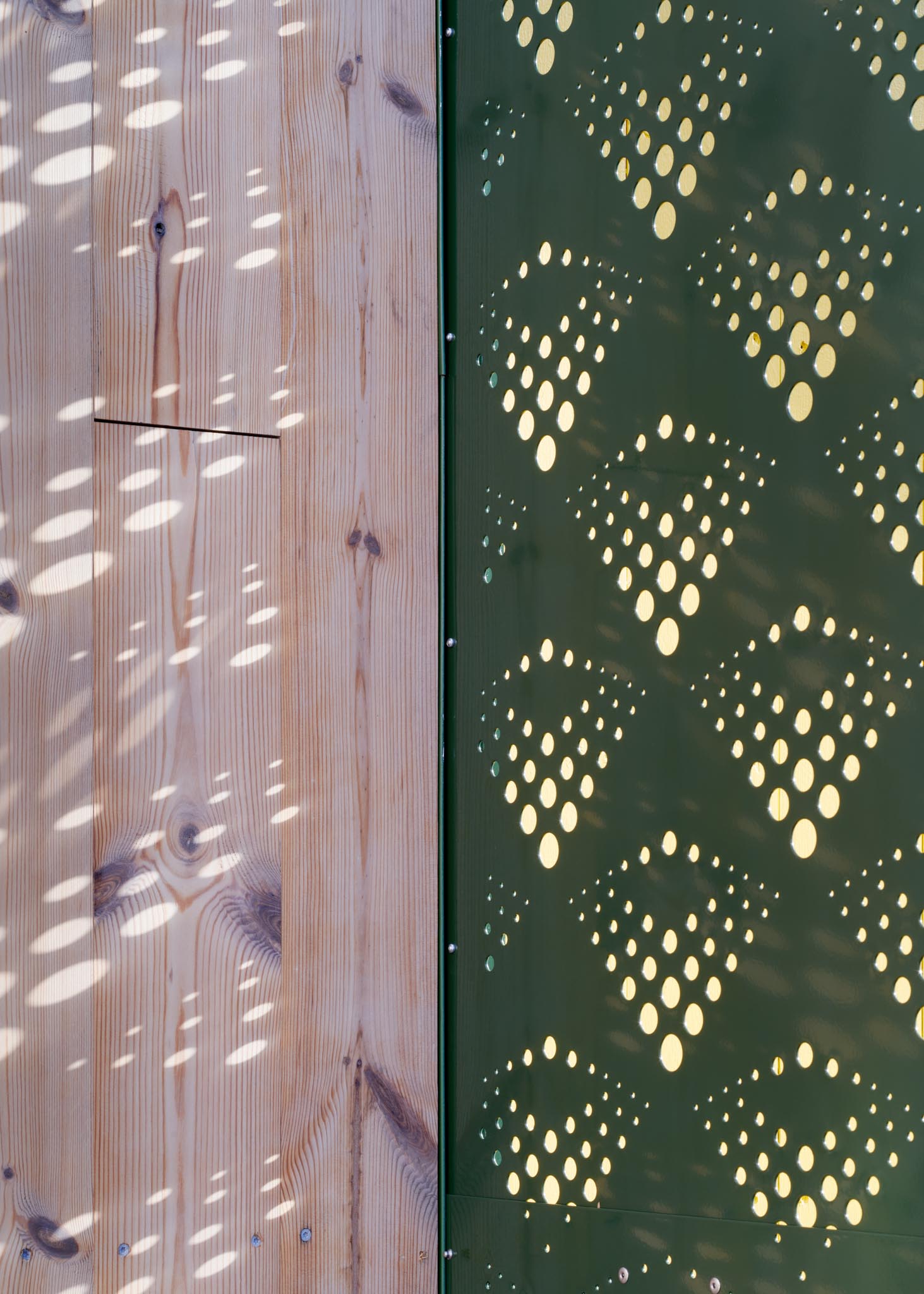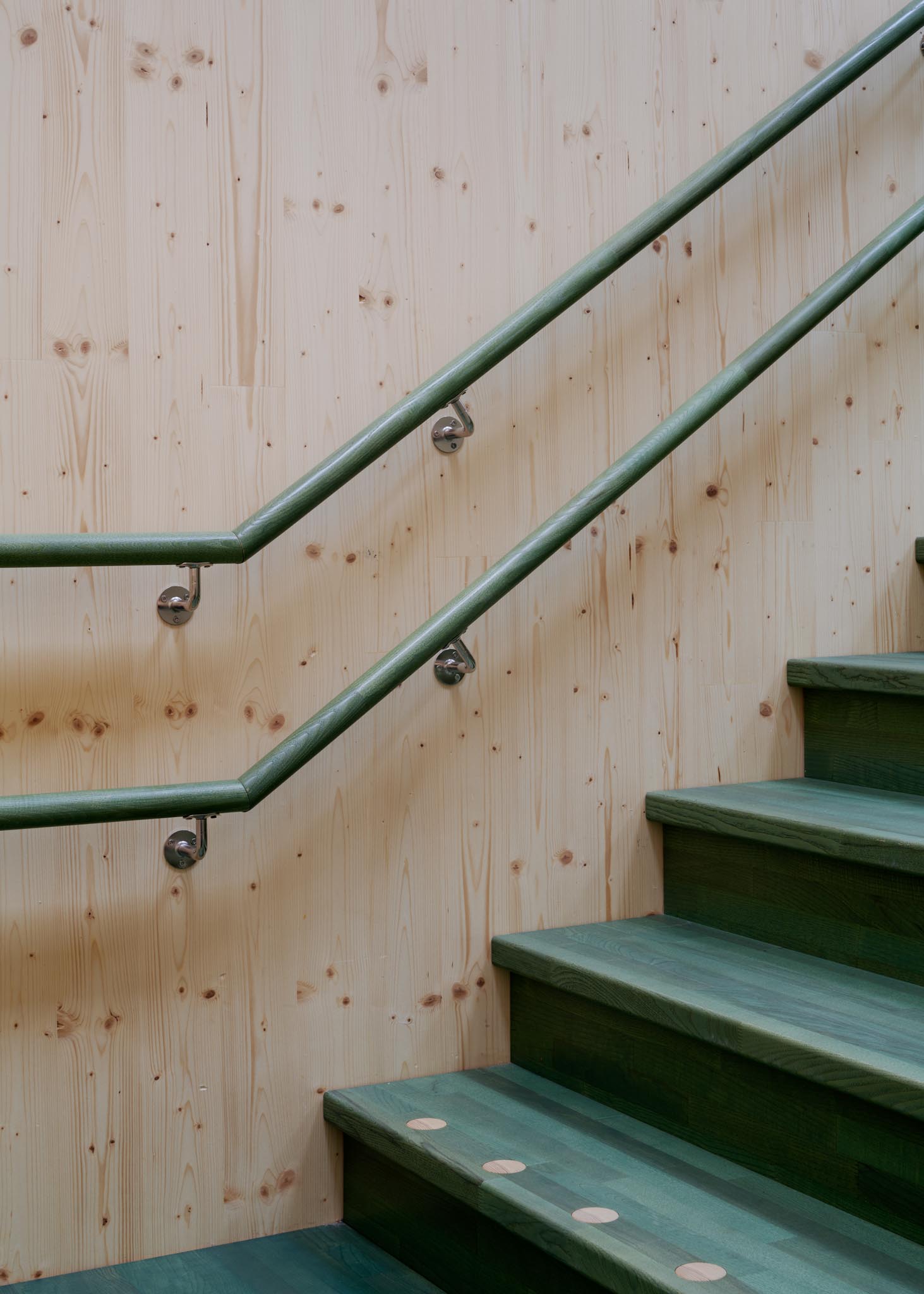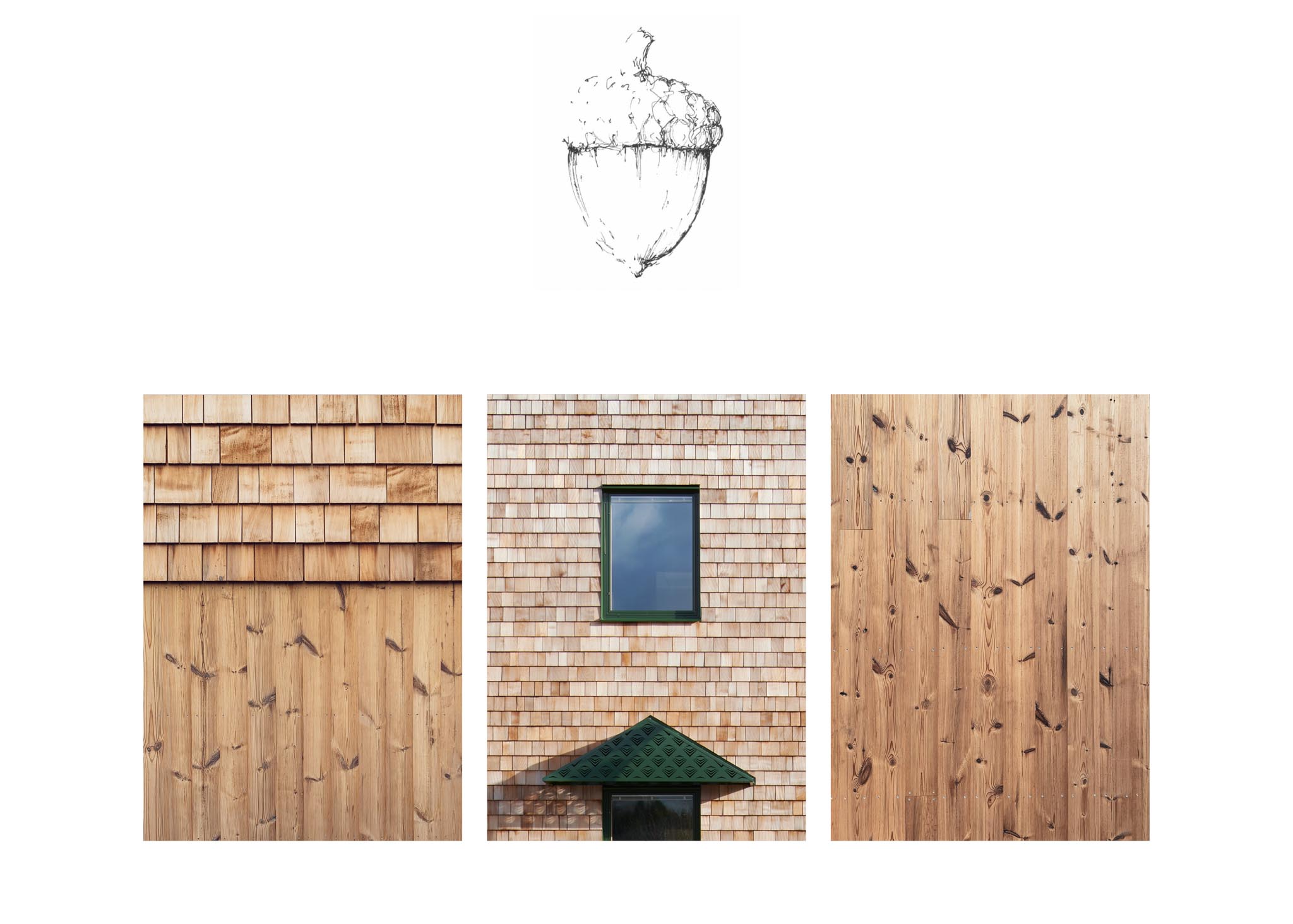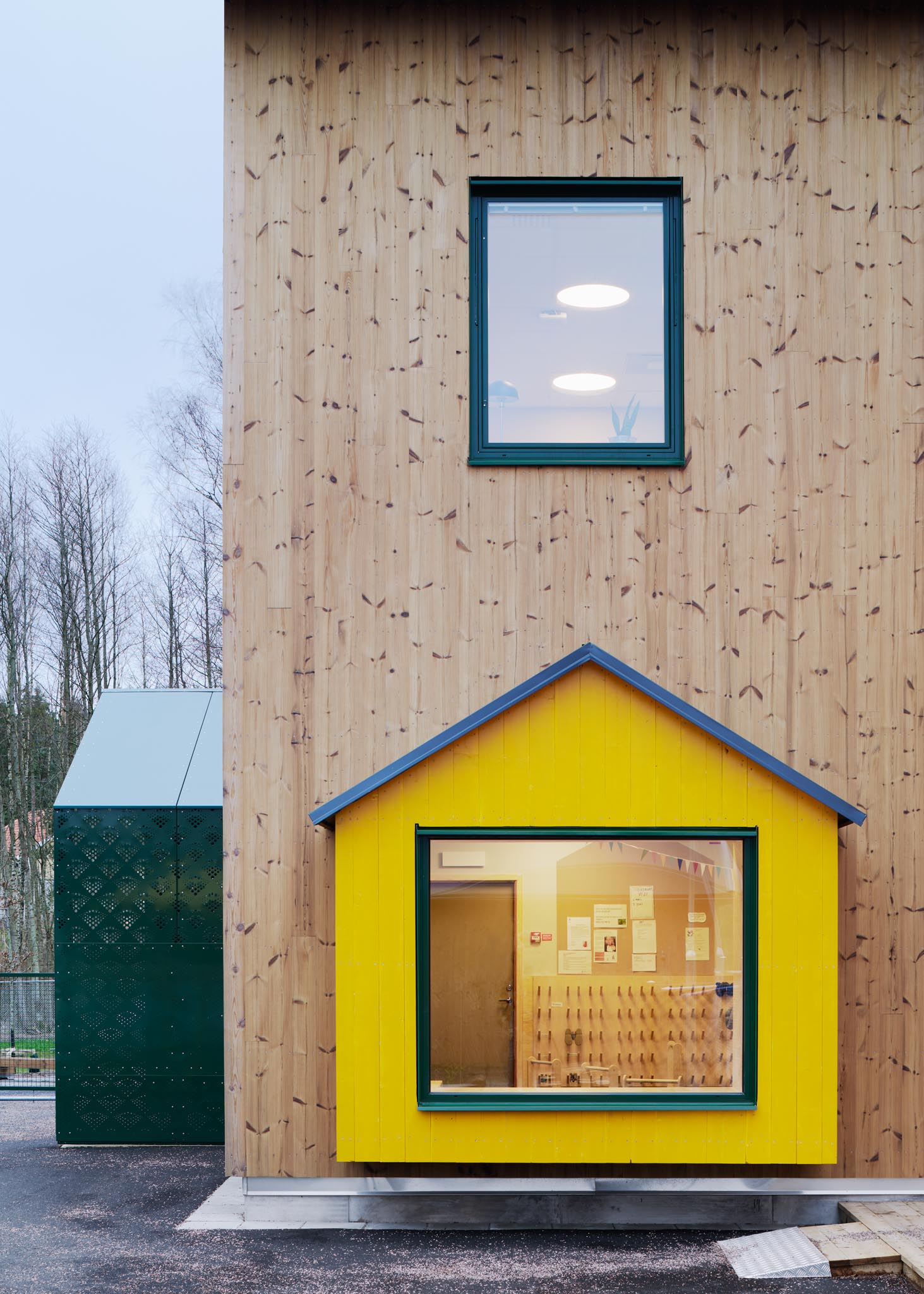 Förskolan byggs i massivträ, ett klimatsmart material som fungerat som tema för både exteriör och interiör. Fasaden kläs med stående furupanel samt träspån av ceder på gavlarna och entrén består av gulmålad plywood. Taket består av mörkgrå plåt medan fönster, dörrar och skärmtak får en grön färg. Invändigt återkommer trä tillsammans med de utvändiga färgerna. Inspirationen är hämtat från Öxeryds skogslandskap.